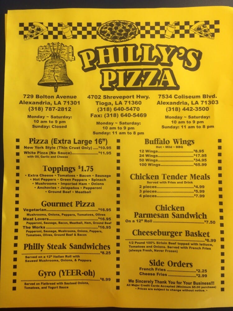 Welcome to Philly's Pizza, located at 729 Bolton Ave in Alexandria, LA. This hidden gem offers a mouth-watering menu of pizzas and sandwiches that will leave you wanting more. Customers rave about the fresh and flavorful dishes, with reviews highlighting favorites like the Philly cheesesteak sandwich, onion rings, and chicken strips made in-house. The efficient and friendly staff ensure a quick and enjoyable dining experience, whether you're grabbing takeout, dining in with a group, or ordering for delivery. With a focus on quality ingredients and impeccable service, Philly's Pizza is a must-visit spot for anyone craving delicious comfort food. Don't miss out on their signature dishes and make sure to try the Philly cheesesteak sandwich for a truly satisfying meal that will keep you coming back for more.